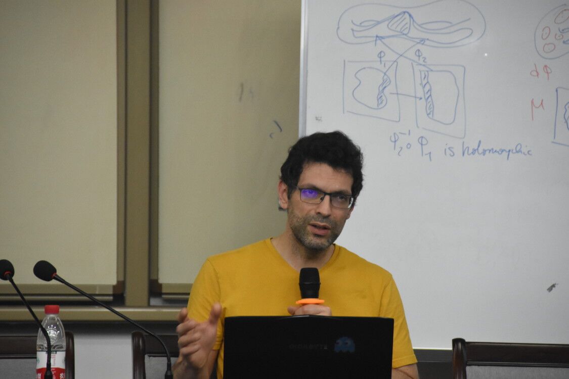讲座正式开始,Cheritat教授先是从一个小问题切入:如果我们生活在一个角度保持不变,但是没有定义尺寸(size)的世界中会怎么样。Cheritat教授首先指出,平面上的线性映射会使圆的形状改变为椭圆。接着Cheritat教授为我们介绍了拉普拉斯-贝尔特拉米算子、共形映射、拟共形映射与椭圆域。由于全纯函数的强大性质,二维闭曲面分类定理得以成立,这使得我们可以用局部坐标刻画光滑曲面,Cheritat教授在白板上为我们形象地展示了这个过程。