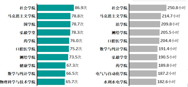 2020--2021学年本科生人均入馆次数及人均在馆时长排名前十的学院