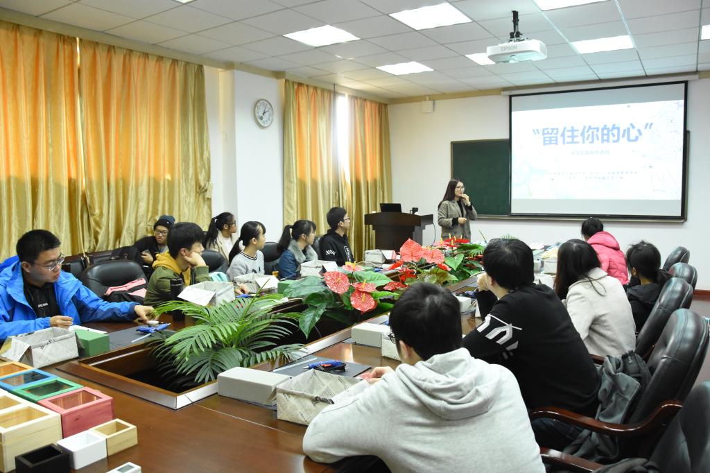 2018年11月24日下午两点,js33333金沙线路检测“巧手灵心”系列团体辅导第三期“留住你的心”永生花盒制作体验在学院三楼顺利举办。参与此次团辅的有学院心理辅导员方圆老师,工作人员随机抽取的10位同学,以及学院心理健康协会的工作人员。