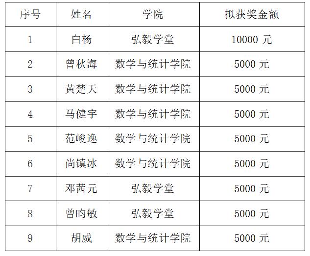 根据《武汉大学数学专业优秀学生奖学金实施细则》精神,经个人申报、教师推荐、评审委员会评审,拟确定白杨等共9名同学获得武汉大学2018-2019学年数学专业优秀学生奖学金。具体情况如下。